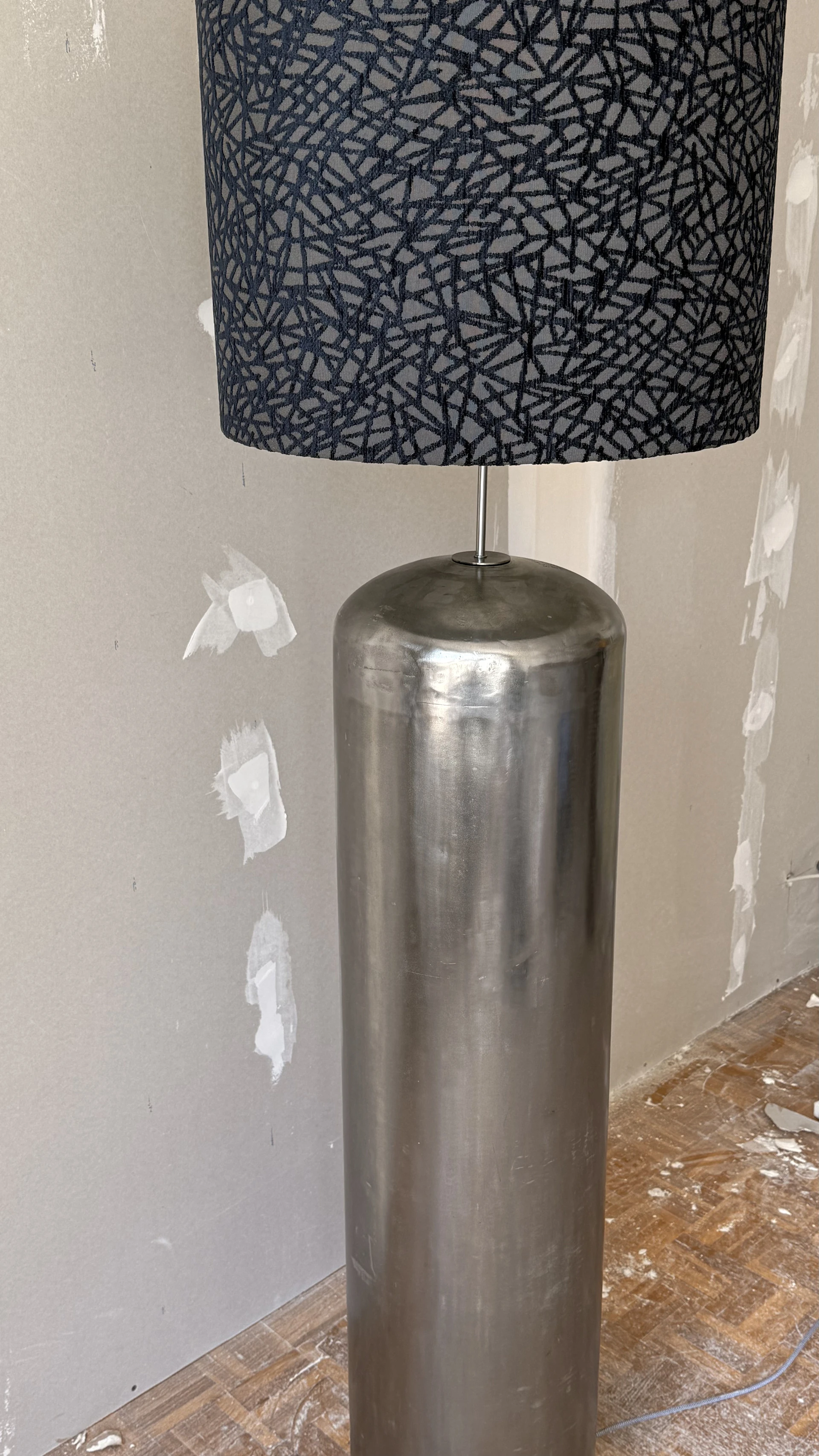 Lampadaire Cylindrique en Aluminium Brossé et Tissu Graphique Noir