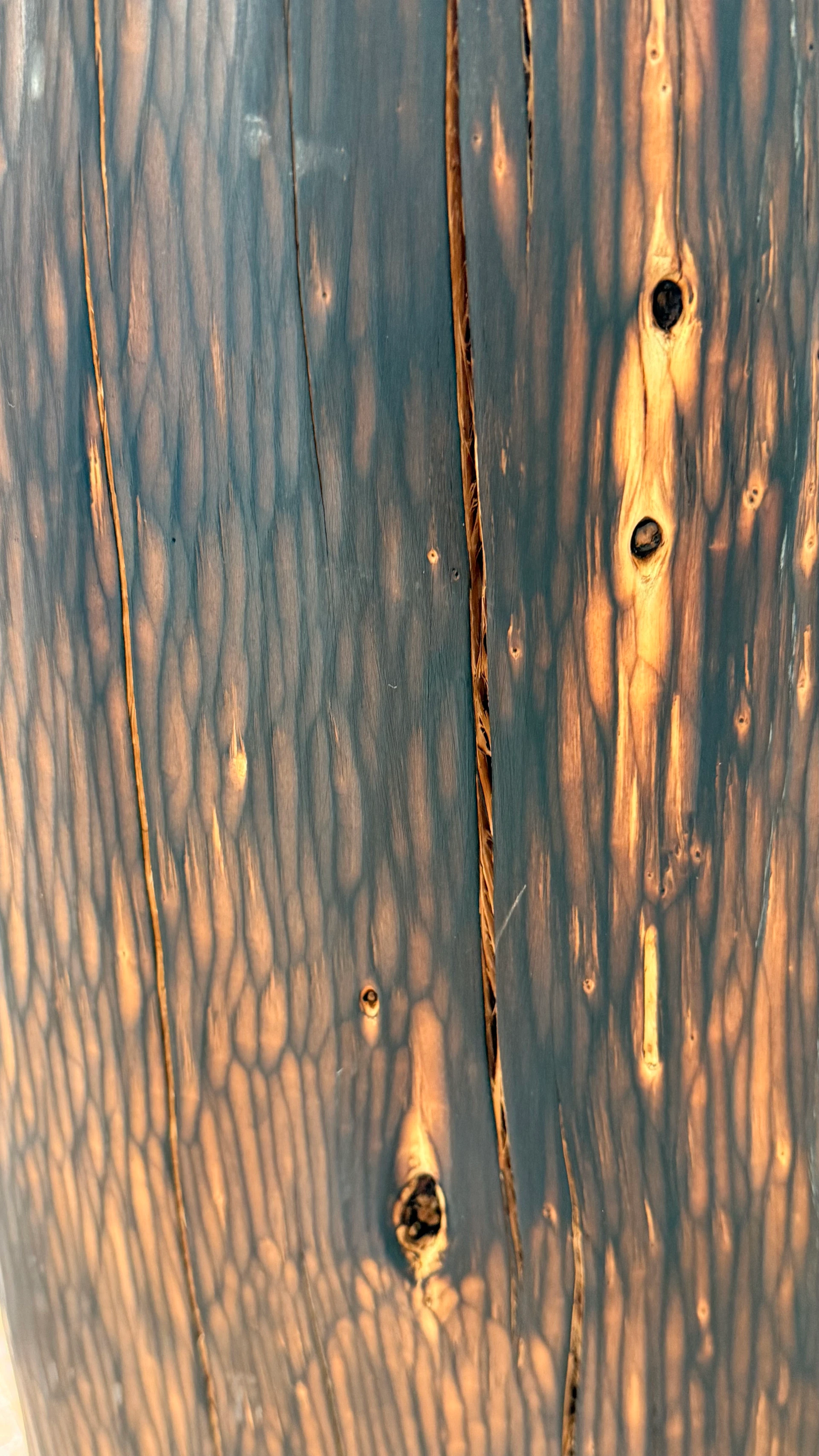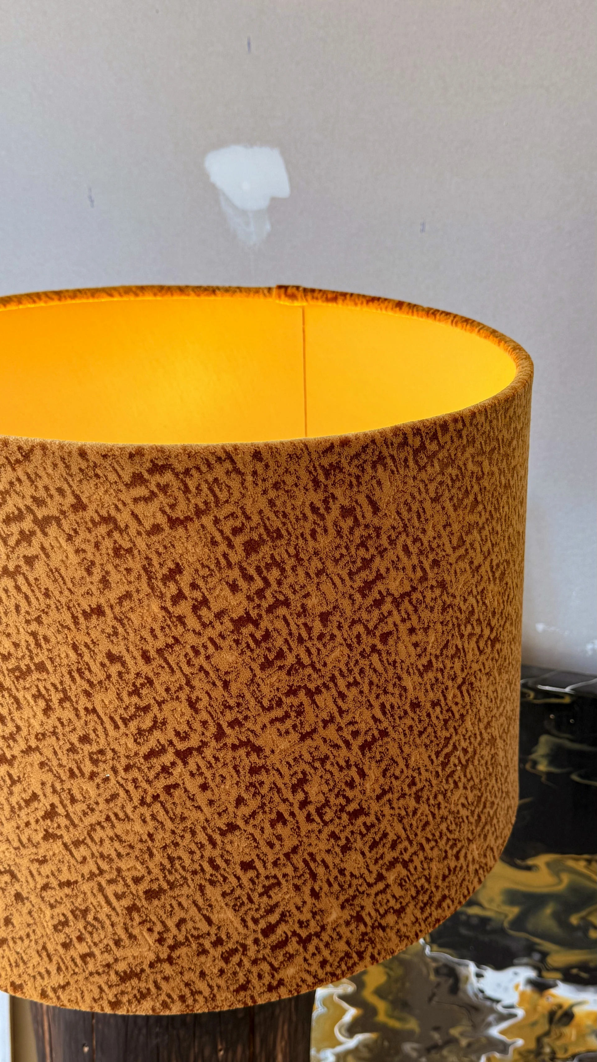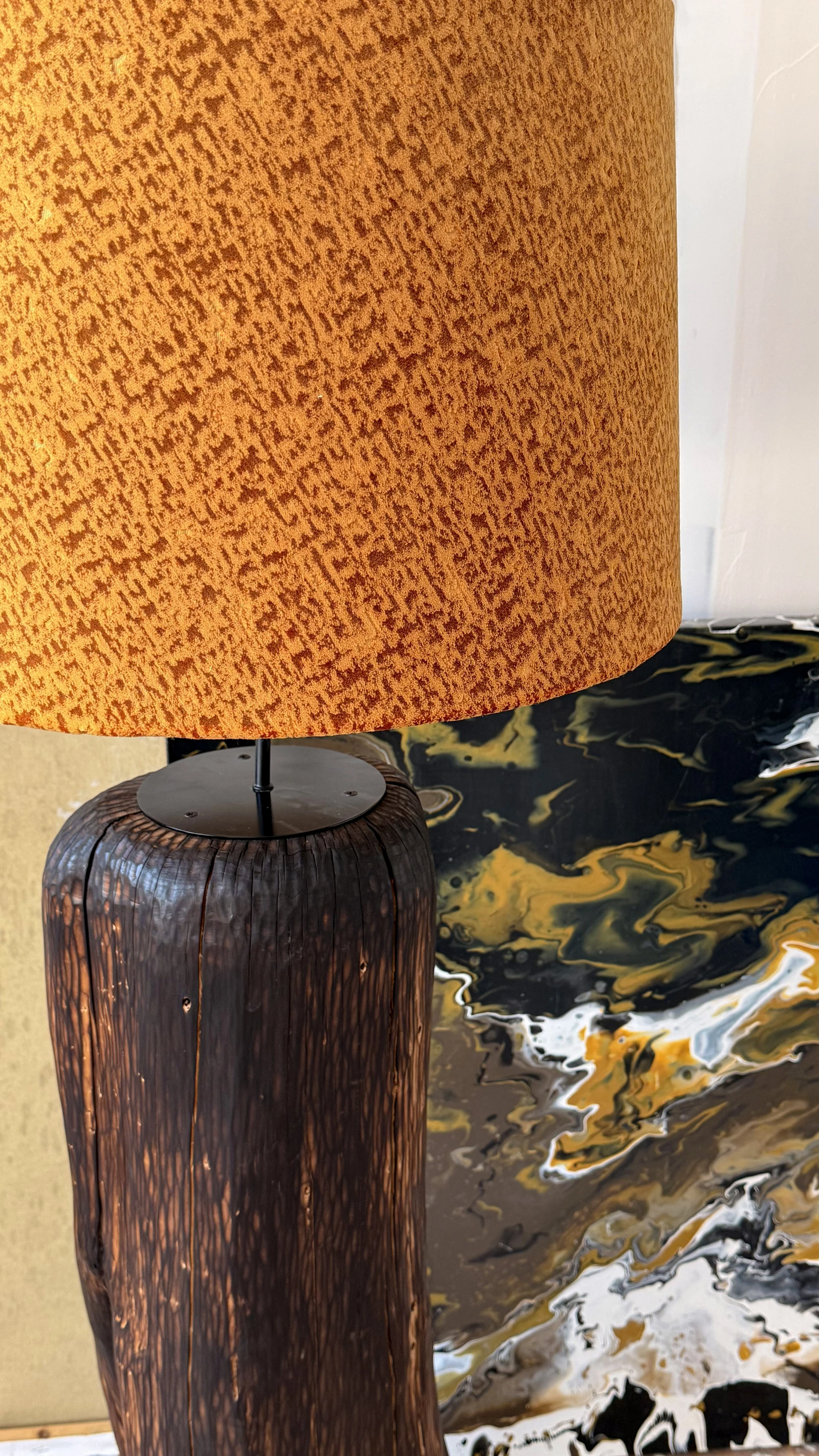 Cette pièce unique incarne la rencontre brute entre nature et design contemporain. Son pied sculptural, taillé dans un tronc massif et subtilement noirci par la technique ancestrale du bois brûlé , dévoile un veinage profond et authentique, chaque fissure racontant une histoire. Surmontée d’un abat-jour cylindrique en tissu nacré à la texture vibrante, cette lampe diffuse une lumière chaleureuse et organique. Véritable objet de caractère, elle trouve sa place aussi bien dans un intérieur épuré que dans un décor plus éclectique.